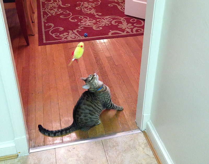 He often gets the bird stuck on top of the fridge or tangled around my roommate’s food processor (we used to keep the alcohol there but quickly learned that was asking for trouble). There’s a certain meow he makes when the bird is stuck. I’m still learning the others.