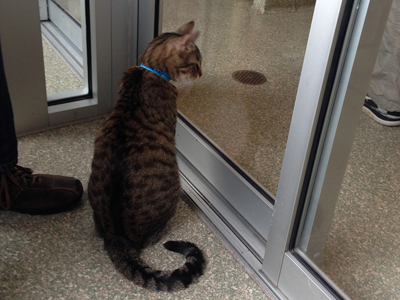 But instead the volunteer introduced us to Normandy, a two-year-old, black and brown tabby. She put us together in a separate play cubby with glass doors and windows. Immediately, Normandy was all over us, rubbing against our pant legs and rolling over on his back. He even used the litter box in our company.