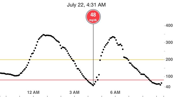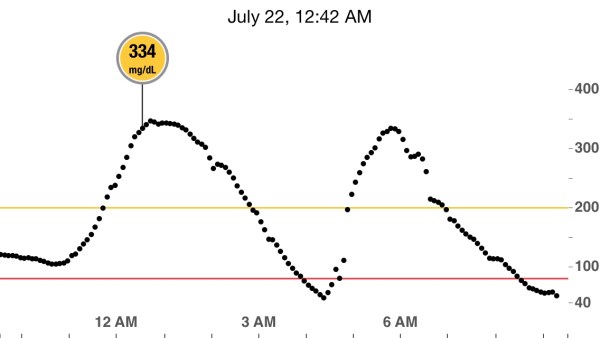 (Snapshots courtesy of my continuous glucose monitor readings I can view through an app on my phone)