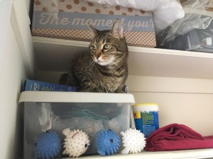 I intentionally posed for this post. I love when the big dumb cat cleans. This means I can sneak into crevices and corners I don’t usually have access to – oh and create a mess and really annoy the big dumb cat. When she yells at me, I just meow back “waffle iron!” I don’t think she gets my insults.